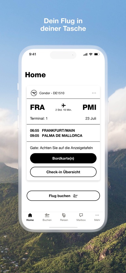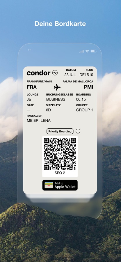 — Nutze den Online Check-in, um deine Bordkarte direkt in der App zu erhalten. Damit gehst du am Flughafen direkt zum Kofferabgabeschalter oder laufe mit deinem Handgepäck direkt zum Gate. Speichere deine Bordkarte sicher in der Wallet deines Smartphones.
