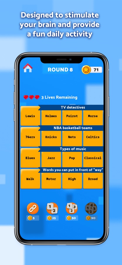 ConnectTheWords challenges your mind with an addictive new twist on word games. Rearrange our 16-square word Grid into four groups of connected words or terms. The concept is simple, the gameplay is intuitive, but the mental workout is substantial!