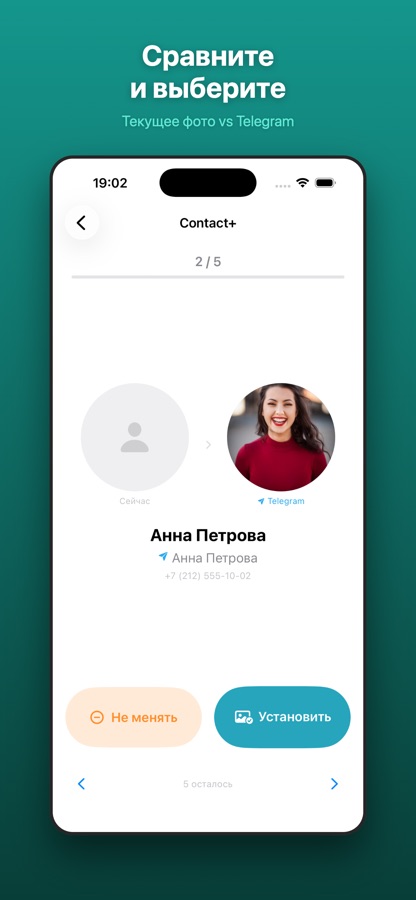 Для каждого контакта вы видите текущее фото из адресной книги и фото из Telegram рядом. Решайте сами — обновить или оставить.