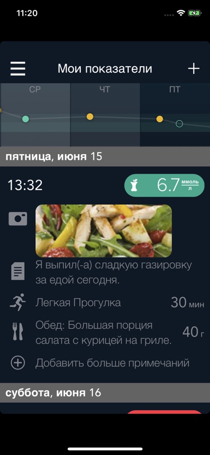 • Мои модели — уведомляет о тенденциях, выявленных в полученных результатах измерения уровня глюкозы в крови, представляет информацию о потенциальных причинах изменений и рекомендации по улучшению результатов.