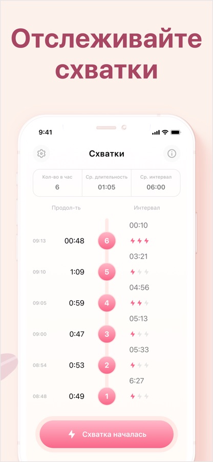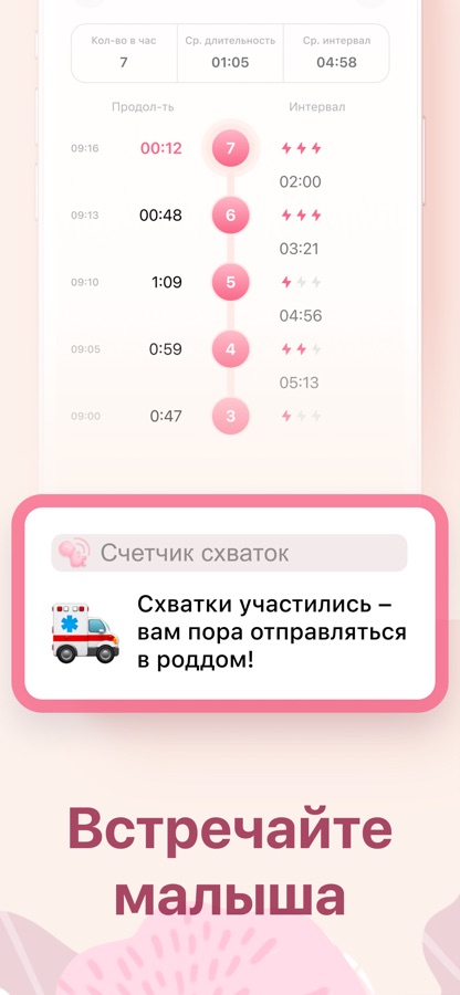 Это приложение не предоставляет медицинские консультации. Наши рекомендации основаны на стандартных показателях. Ваши роды могут протекать по-другому. Всегда консультируйтесь с врачом, чтобы сориентироваться в частоте и продолжительности схваток.