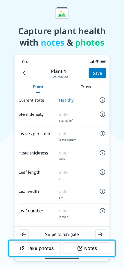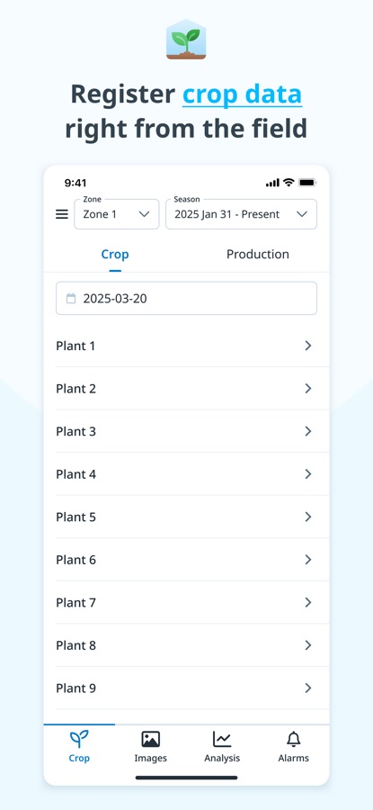 • Register crop data from the field in seconds—no more spreadsheets or paper logs.