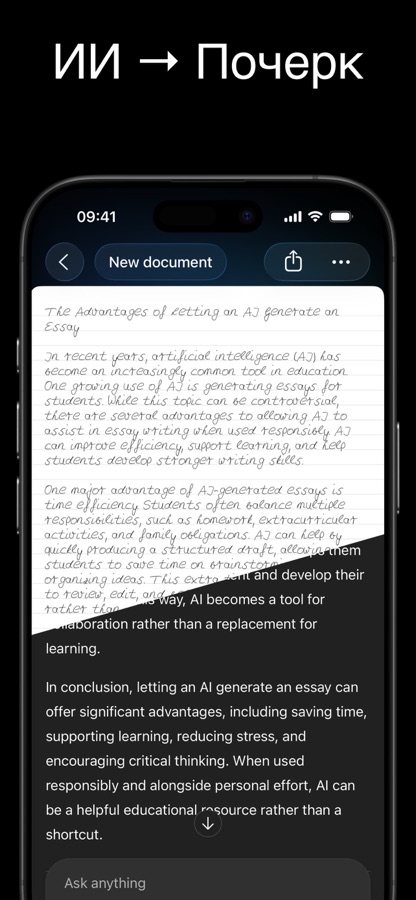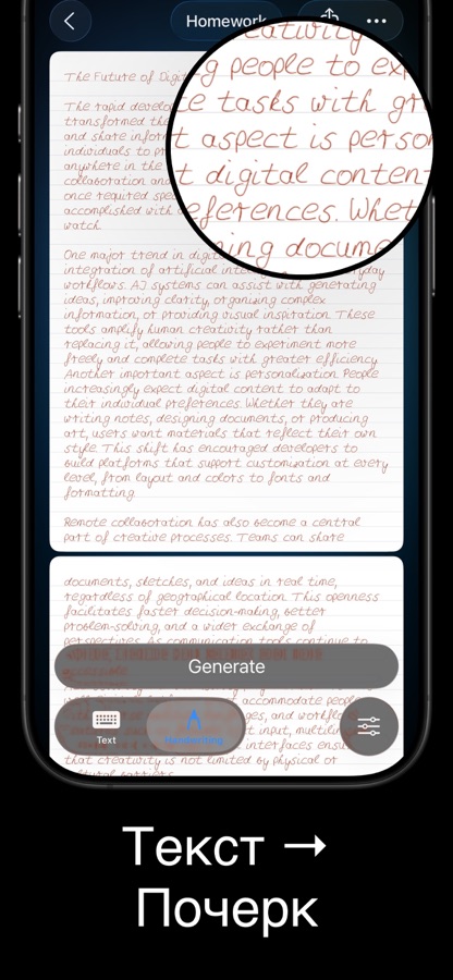 Преобразуйте напечатанный текст в свой реалистичный почерк. Идеально подходит для домашних заданий, заметок и рукописных документов.