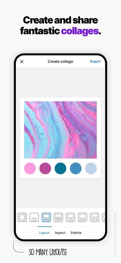 • Choose by several layouts and create beautiful collages with photos and palettes