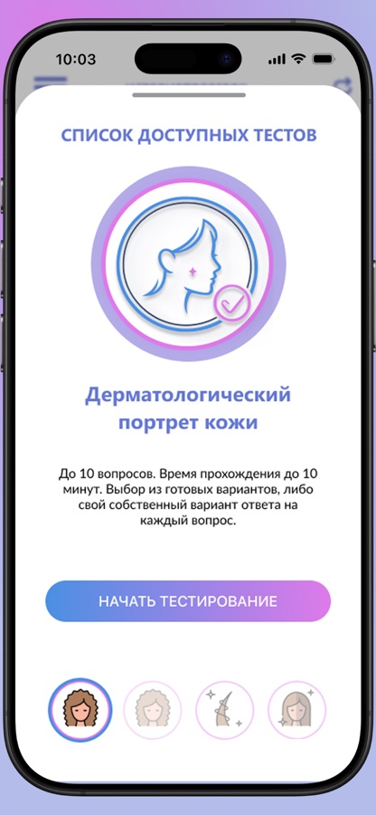 Дерматологический портрет кожи, Тип профиль волос, Морфотип старения, Кудрявый метод. По каждому тесту определение персональных особенностей и умный подбор эффективных именно в вашем случае косметических ингредиентов. Персональные рекомендации.