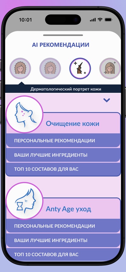 Простой и удобный функционал поможет составить оптимальную программу по уходу за лицом и волосами, оценит свойства косметики по составу.