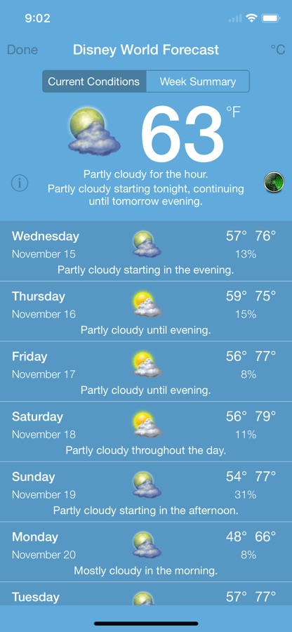 — A 7 day forecast of the weather at Disney World