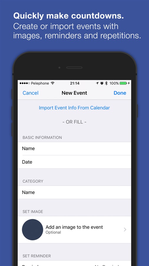 Начните отсчет до следующего дня рождения вашего друга, следующей поездке зарубеж, следующем отпуске или другого важного события с помощью программы обратного отсчета, которая сообщает об оставшихся месяцах, неделях, днях, часах и минутах!