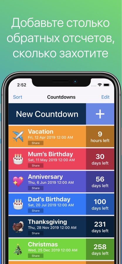 Отслеживайте все свои важные события: отпуск, день рождения, праздник, вечеринку, Рождество, Хэллоуин, круиз, День святого Валентина, свадьбу, годовщину, рождение ребенка, окончание учебы, беременность, поездку, выход на пенсию, игру, цели, концерт и многое другое.