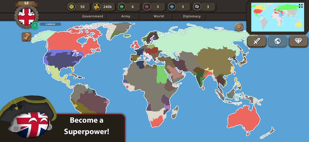 Declare war or form alliances with other nations. Sign peace treaties, send alliance requests, and even puppet weakened countries to expand your influence. Choose your allies wisely – rivals will attempt to capture your territories and defeat your nation!