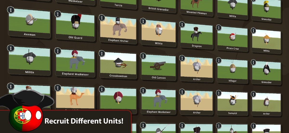Unlock and upgrade special units unique to each country. Build infantry, tanks, artillery and more in your Barracks and Artillery Depot. Each countryball nation has unique military units and strengths – develop your forces and prepare for new units coming in future updates.