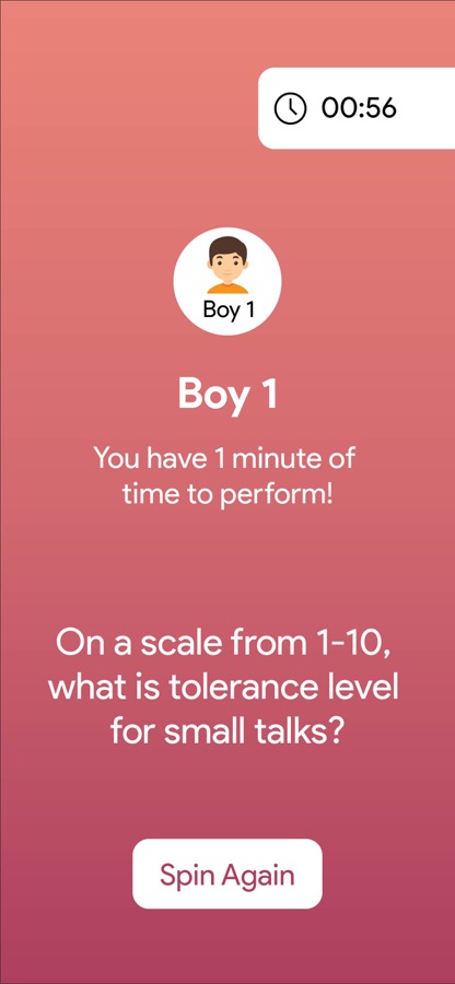 Truth and Dare: you can Spin a virtual bottle game to randomly select a player that will have to choose between a question or challenge.
