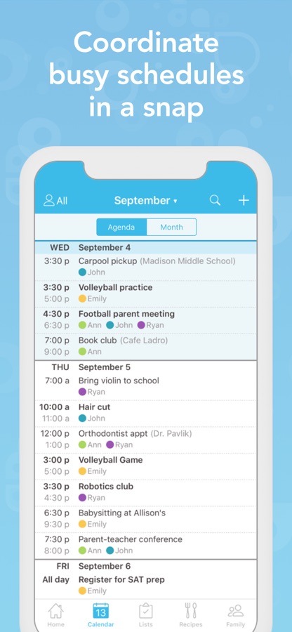 • Keep track of everyone’s schedules in one place with a simple color-coded calendar