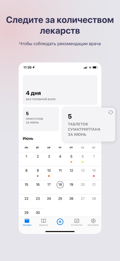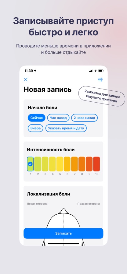 Быстрое и понятное создание записей о головной боли. Делайте запись про текущий приступ боли всего лишь в два нажатия.