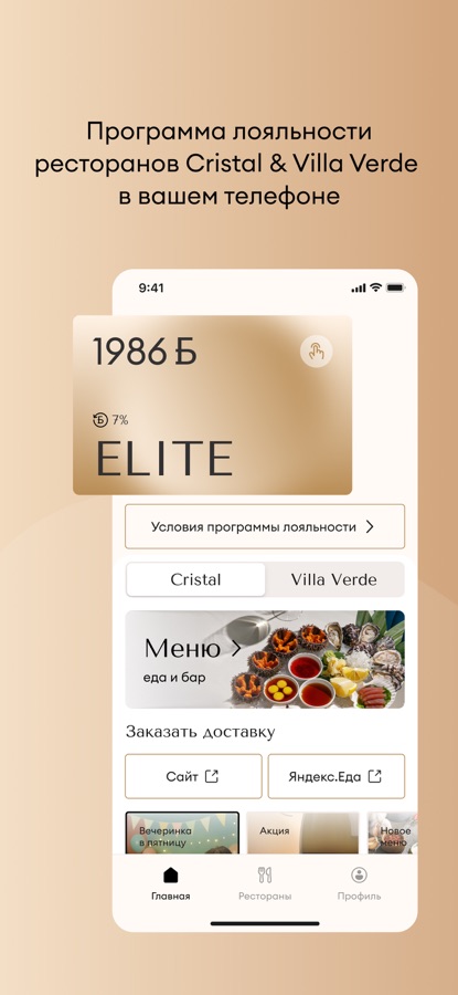 Станьте участниками программы лояльности ресторана CRISTAL: предъявляя клубную карту при каждом посещении, Вы можете копить бонусы и оплачивать ими до 90% от суммы счёта. Бонусы начисляются в соответствии с Вашим уровнем привилегий.