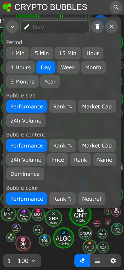 Crypto Bubbles is perfect for getting an overview of the general movement trend of the cryptocurrency market or spot outsider cryptocurrencies,