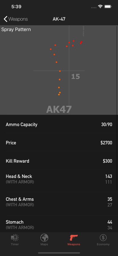 — Weapon info with spray patterns: Keep missing that headshot? Check out every weapon’s specific recoil pattern so that you can tighten up your aim. Weapon information such as price, ammo capacity, and damage are also provided for your convenience.