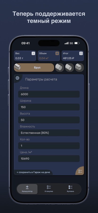 ⋅ Возможность считать не только кубатуру доски и бруса, но и кубатуру круглого бревна, а также круглой трубы, профильной трубы, и арматуры.