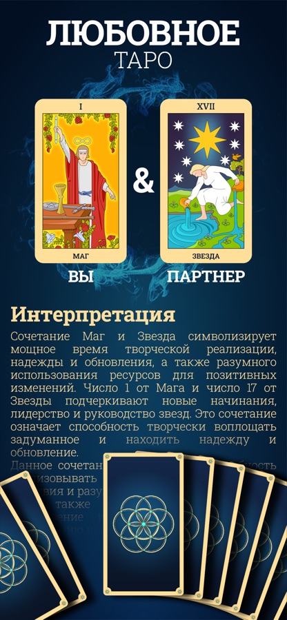 Хотите, чтобы гадалка была у вас в телефоне? Конечно, хотите! Наше приложение для гадания на картах Таро станет вашим помощником, если вы сомневаетесь или нуждаетесь в уверенности. С помощью карт Таро, гороскопов и уроков по изучению Таро вы можете узнать многое о своей личности, любовных отношениях или карьерном росте. Получите быстрый ответ с раскладом на 3 карты, более детальную интерпретацию с раскладом на 6 карт или ответ на ваш вопрос «Да/Нет». Изучите всё о Таро с помощью наших подробных уроков. Читайте свой ежедневный гороскоп или гороскоп совместимости. Как только вы начнёте, вам это понравится!