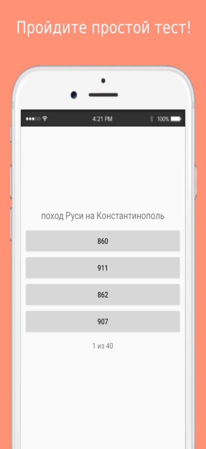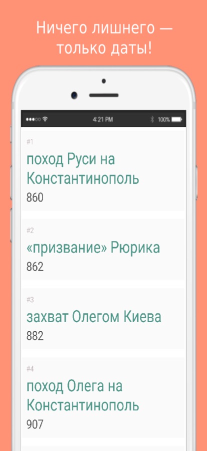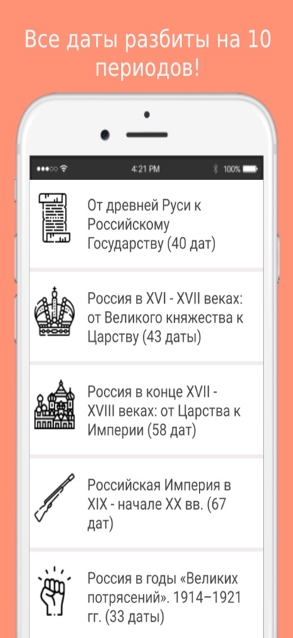 Данное приложение позволит вам запомнить все основные даты по истории России. Просто выберите нужный период, запомните даты, а после, пройдите простой тест. Ваша цель — выучить все даты за выбранный период на 100%!