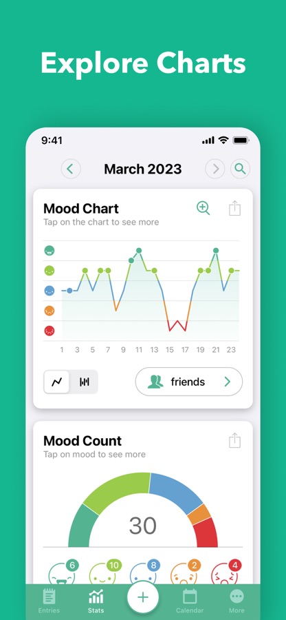 Все записи можно отслеживать на графиках или в календаре. Кроме того, ими можно поделиться с друзьями.