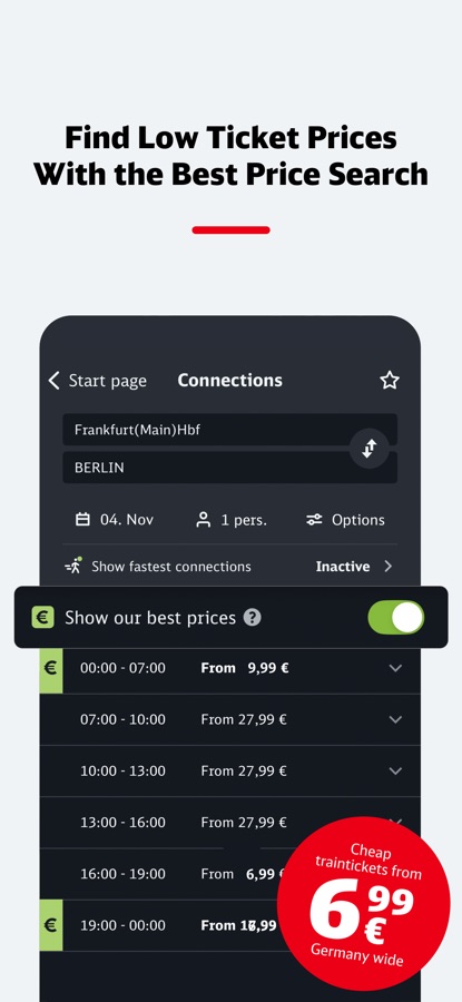 — With the best price search, you’ll always find the lowest prices: cheap traintickets from 6,99 € German-wide.