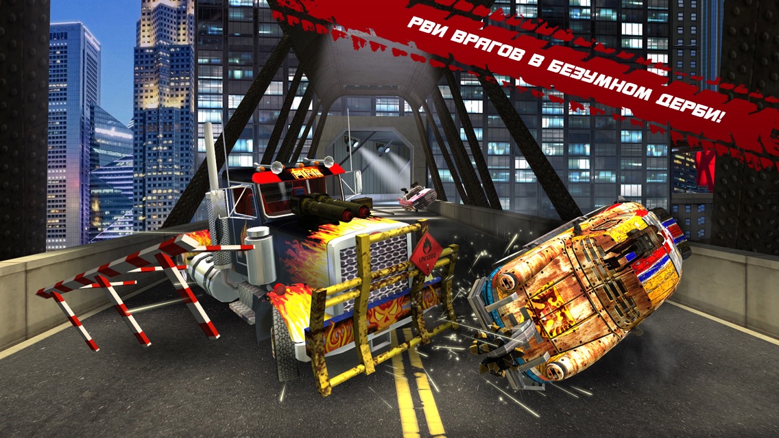 Доберись до верхушки преступного мира, сметая всех, кто стоит у тебя на пути. Выбери машину по вкусу, прокачай её в гараже и порви врагов на части в разрушительном Дерби. Стань легендой боевых гонок на выживание!