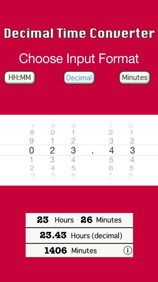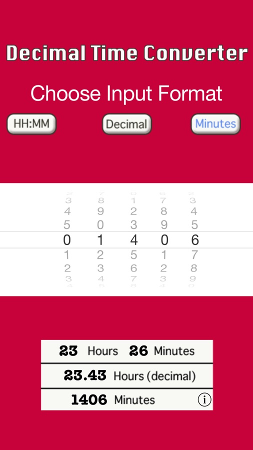 Input values can be entered as hours:minutes, decimals, or just minutes, by selecting the input mode at the top of the screen. All conversions are displayed instantly in the lower half of the screen.
