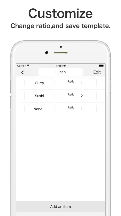 2.Input [Item name] and [Ratio].If you set more Item,push [Add an item] button.