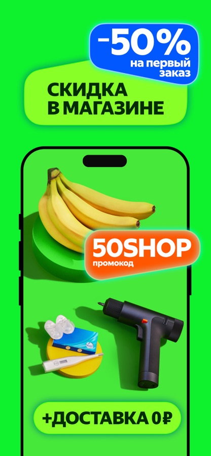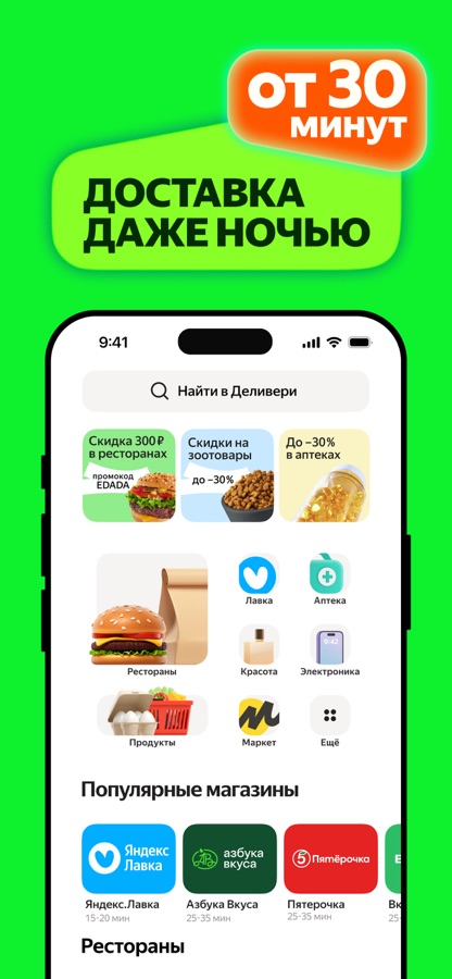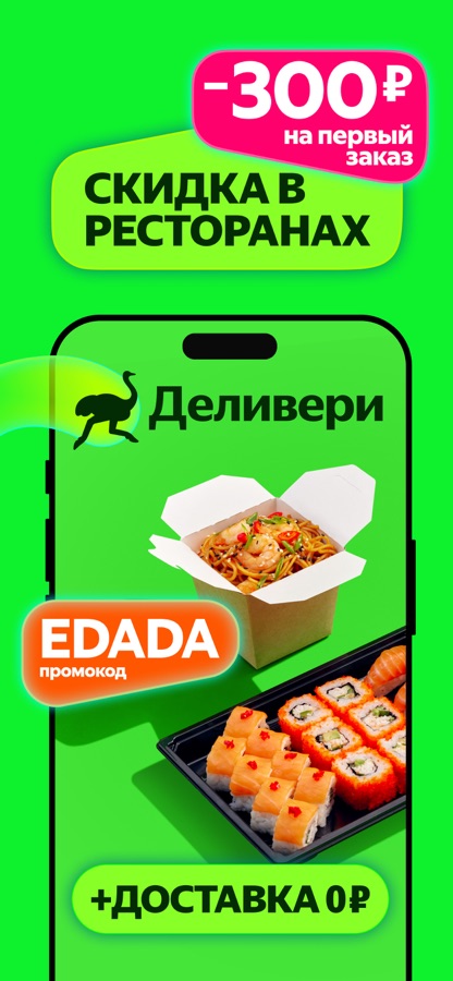 - Скидки на первые заказы в новых магазинах и ресторанах.
