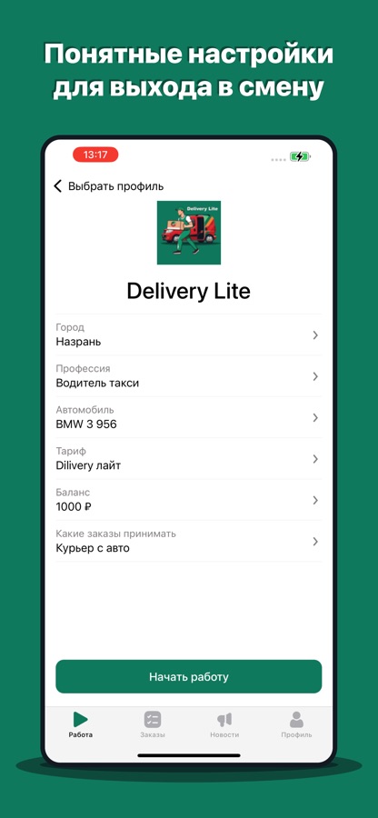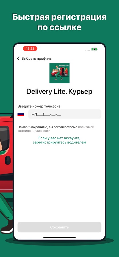 Для начала работы необходимо заполнить анкету для регистрации в Delivery Lite. Курьер. После прохождения проверки вы сможете выйти на смену под своим номером телефона и смс кодом.