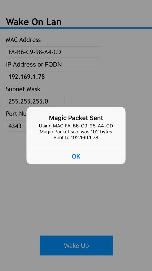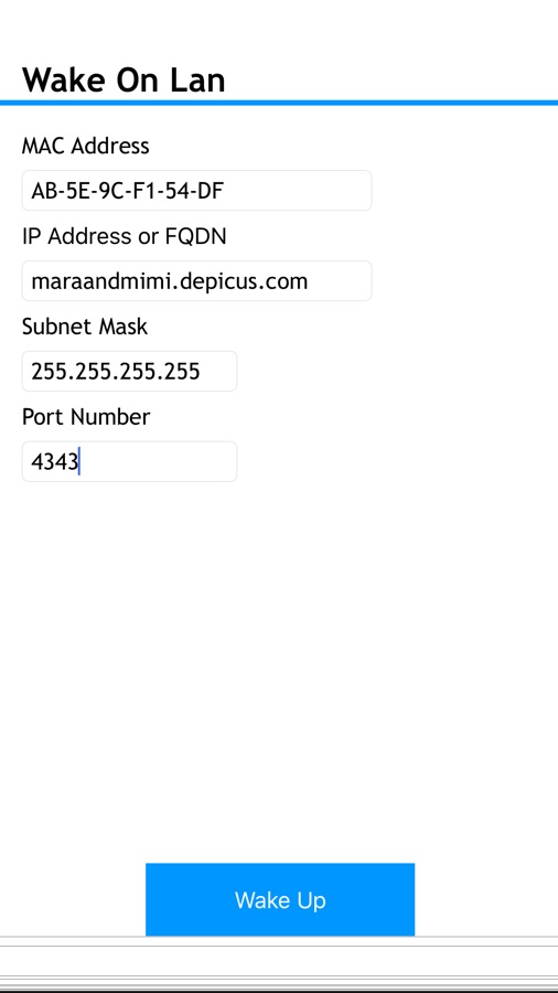 NB: Wake On Lan and Wake On Wan will not work to wake up a computer using only wifi although you can use this application to wake up machines if you are connected to wifi or 3G/4G. Also note that some Mobile Operators block UDP ports lower than 1024 over their networks, try using a higher port number e.g. 4343