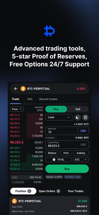 The app is equipped with advanced trading tools such as Limit, Market, Conditional and Trailing orders; GTC, GTD, IOC, FOK time-in-force settings; Deribit-only implementation of Post-only with automatic price adjustment and Testnet for mobile app.