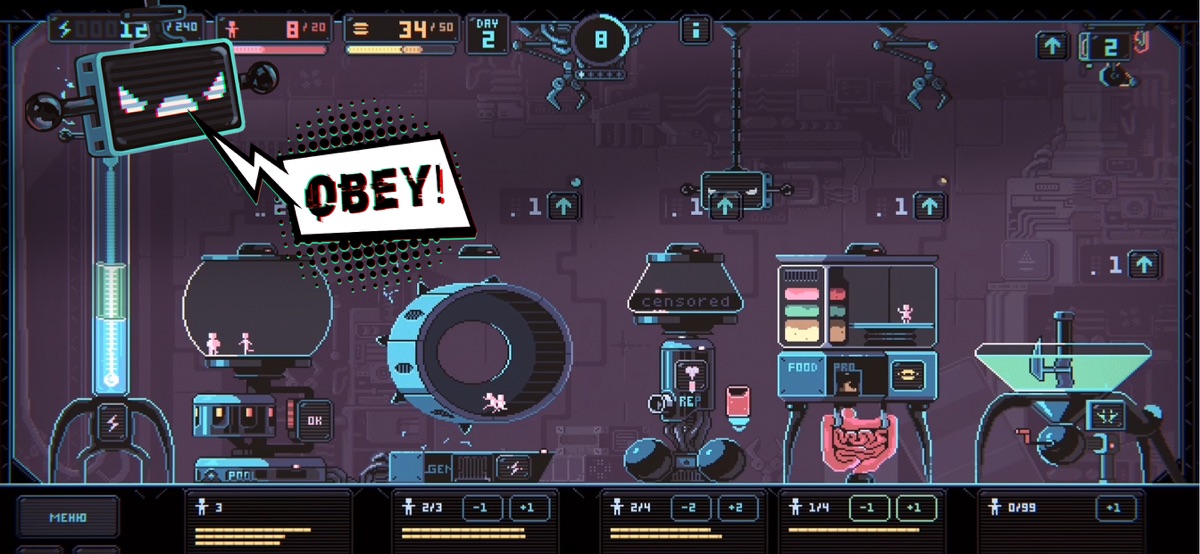 Основной геймплей представляет из себя перетаскивание людишек между разными зданиями с помощью механических клешней. В одном здании человеки отдыхают, а в остальных работают. Людишки должны добывать для нас энергию, которая постоянно расходуется, и кроме того, они должны размножаться и вырабатывать для себя еду. Нужно продумывать стратегию и тактику, и внимательно следить за каждым человеком, чтобы он не умер от усталости! Элемент рогалика (roguelike) заключается во-первых в том, что в игре не будет сохранений — каждый раз придется начинать заново. Кроме того, после каждых пяти кормёжек происходит случайное событие — текстовый квест. Правильный выбор может дать какой-то бонус, а неправильный — увидите сами! Множество модификаторов, которые можно получить в случайных событиях, полностью меняют внешний вид игры.