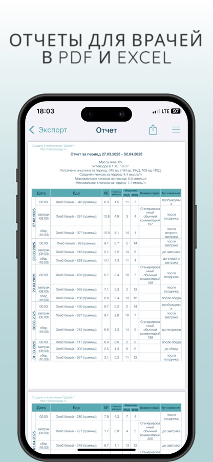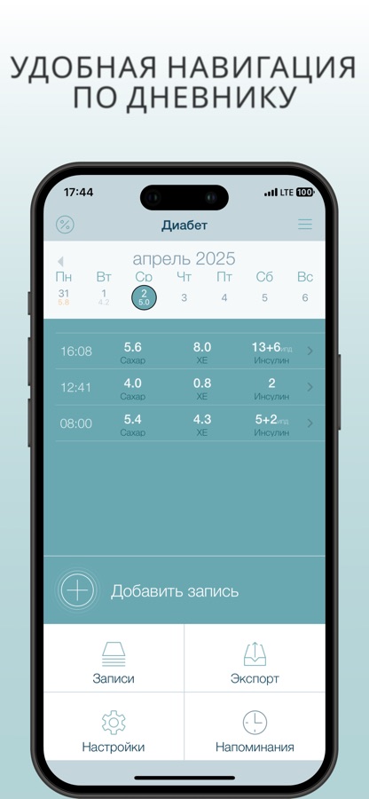 Приложение Диабет создано для ведения дневника контроля и расчета дозы инсулина при инсулинозависимом диабете. С его помощью Вы сможете получить расчет необходимой дозы инсулина, избежать приступов гипогликемии, вести дневник питания, контролировать уровень глюкозы в крови, а также следить за суточной нормой инсулина. Приложение поможет Вам не только поддерживать норму глюкозы в крови, но и контролировать свое питание и вес. Также в приложении существует возможность удобного экспорта данных для внешнего контроля лечащим врачом и предоставления ему необходимой информации Вашего образа жизни с целью корректировки нужного именно Вам коэффициента инсулина.