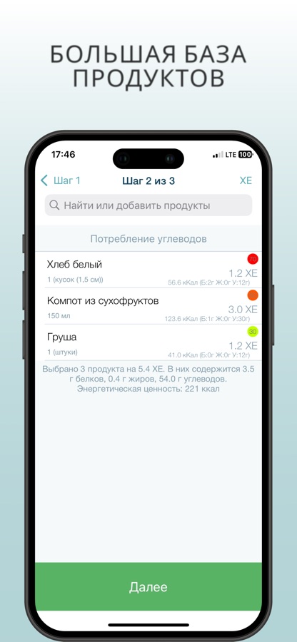2 шаг: введение потребляемых Вами углеводосодержащих продуктов из удобной базы продуктов. Также приложение содержит удобный способ измерения их количества. Вы можете указать вес продукта, если это известно, или примерное количество, которое можно определить «на глаз» (например, жидкость в стаканах, хлеб в кусках и т.д.). Если база продуктов не содержит потребляемый Вами продукт, то его можно ввести вручную, указав количество содержащихся в нем углеводов (хлебных единиц);