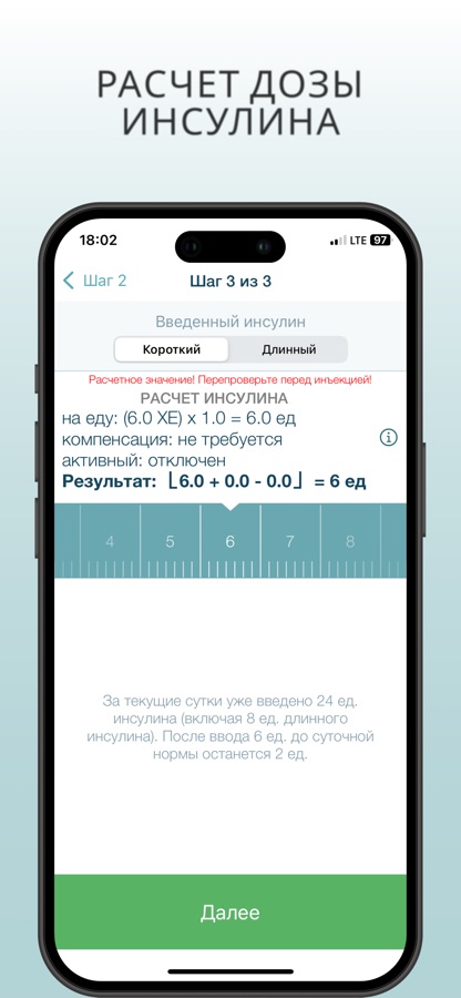 3 шаг: приложение рассчитает для Вас необходимую в это время суток дозу инсулина, которая также может быть скорректирована вручную.
