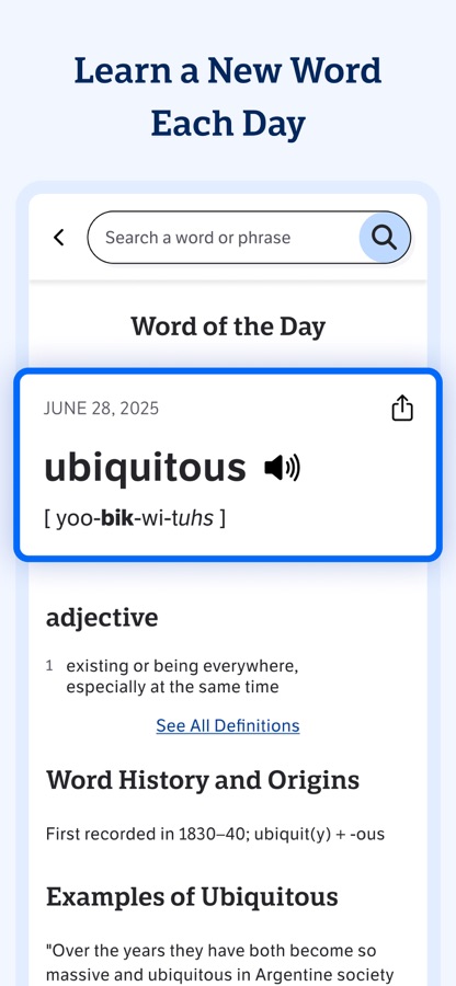 With more than 2 million trusted definitions and synonyms, this English dictionary and thesaurus app for iPhone is optimized for your mobile device. Improve your English vocabulary, whether you’re just starting your learning journey or you’re already a word wizard. Install the app for access to definitions and synonyms whenever and wherever you need them — no bulky books necessary. Flip to dark mode to give your eyes a break, or stick to the traditional set-up.