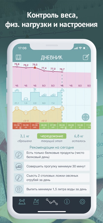 • Дневник диеты: контроль веса, физической нагрузки и настроения;