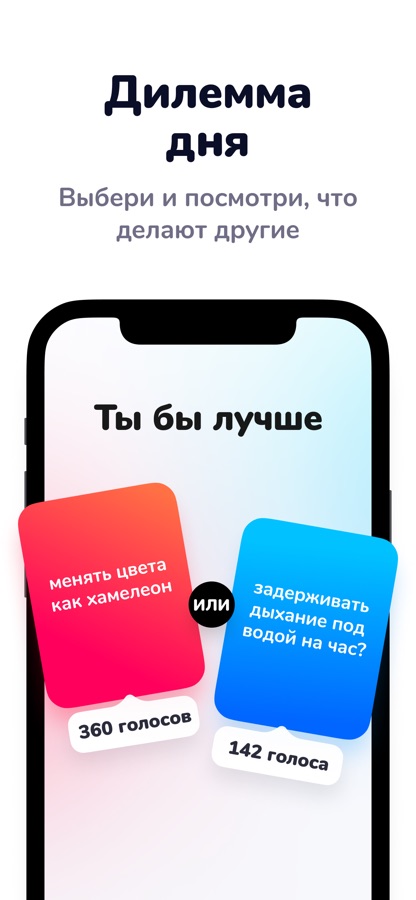 Что бы ты выбрал? Тебя ждут больше 3 000 дилемм в 20+ категориях, от повседневных выборов до невозможных сценариев. Играй один, с другом или передавайте телефон по кругу. После выбора посмотри, как проголосовали миллионы других игроков. Возможно, ты удивишься.