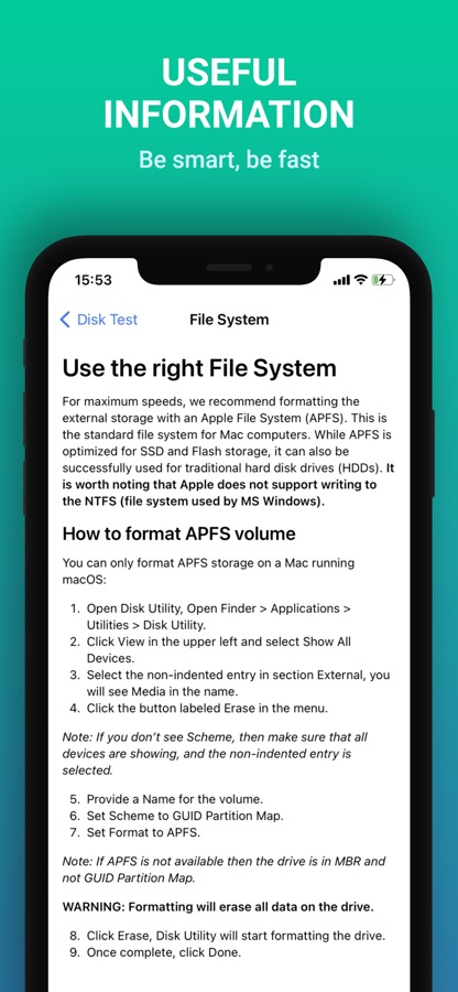 Both your device and connected storage affect the speed of communication with the data storage. It’s not just the technical specification of the storage itself that is important for proper function, but also how it is connected. In particular the quality of the cable used, the characteristics of the connected USB Hub, the parameters of the Hard Drive Enclosure, or even the Adapters used. The File System of your storage device is equally important in the process of achieving the maximum speed. All this can be a bottleneck for your daily work. With Disk Test by Magic Benchmark, copying larger data will never be a nightmare for you again.