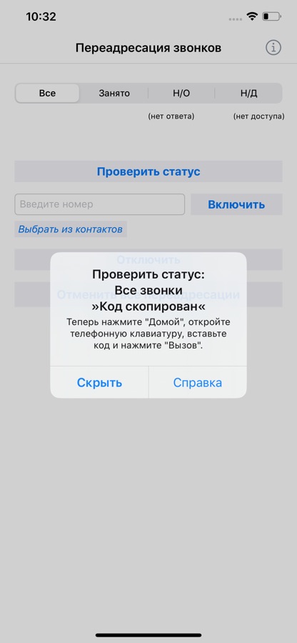 • Приложение создает код переадресации в соответствии со стандартом GSM. Чтобы применить переадресацию, код нужно вручную вставить в приложение «Телефон» и нажать кнопку «Вызов».