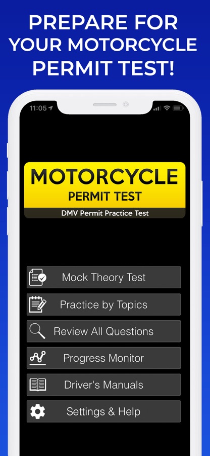 Motorcycle Permit Test offers the most advanced test system to your iPhone, iPod Touch or iPad offering practice over 340 up to-date DMV questions. Don’t take any chances at the DMV. With Motorcycle Permit Test, you’ll be prepared!