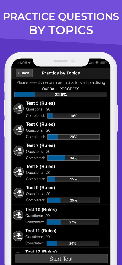 * Track and monitor your progress. Analyse your performance and find out when you have reached test standard.