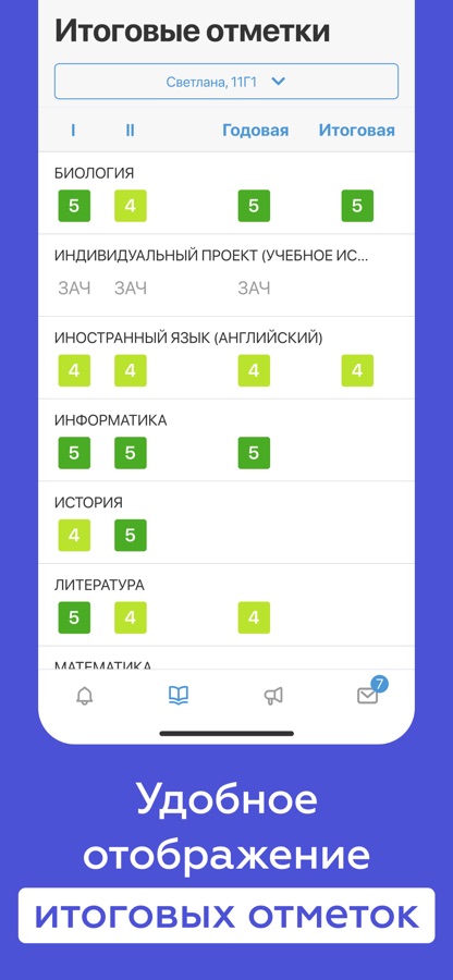 Приложение позволяет получить доступ к просмотру дневника с информацией о полученных отметка, комментариях к ним и выданных домашних заданиях. Возможно просмотреть текущие отметки за учебный период с расчетом среднего балла по предмету, результаты промежуточной и итоговой аттестации учащегося, а также расписание уроков с указанием кабинета и преподавателя.