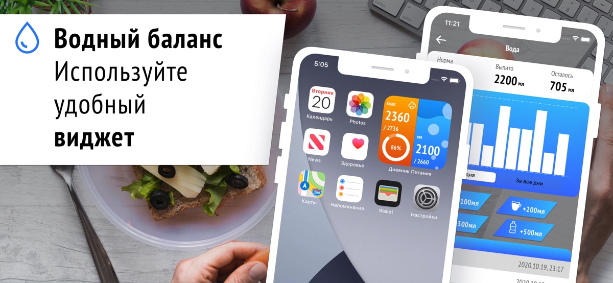 • Используйте удобный виджет и следите за калориями и выпитой водой прямо на главном экране.