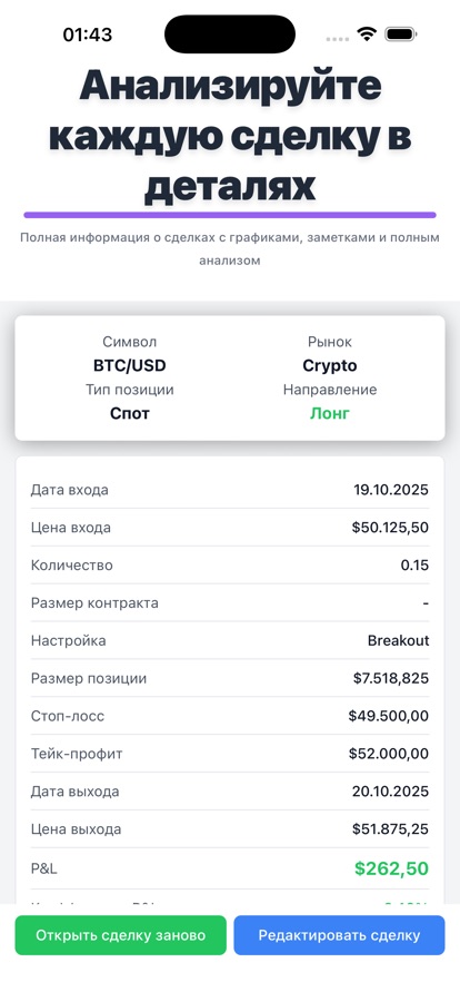 Легко записывайте ключевую информацию о сделках, такую как цены входа/выхода, размер позиции и скриншоты.