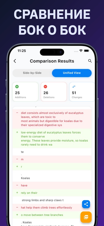 Режим «Бок о бок»: Мгновенно находите добавления (Зеленый) и удаления (Красный).
