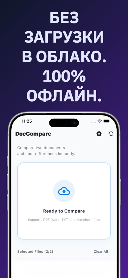 КОНФИДЕНЦИАЛЬНОСТЬ ПРЕЖДЕ ВСЕГО Мы верим в абсолютную конфиденциальность. DocCompare обрабатывает всё локально на вашем устройстве iOS. Мы не собираем, не храним и не загружаем ваши документы.
