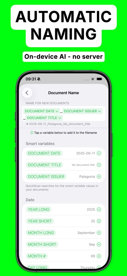 • Automatic document/file naming with patterns (e.g., document date, title, issuer, time, text, counter)